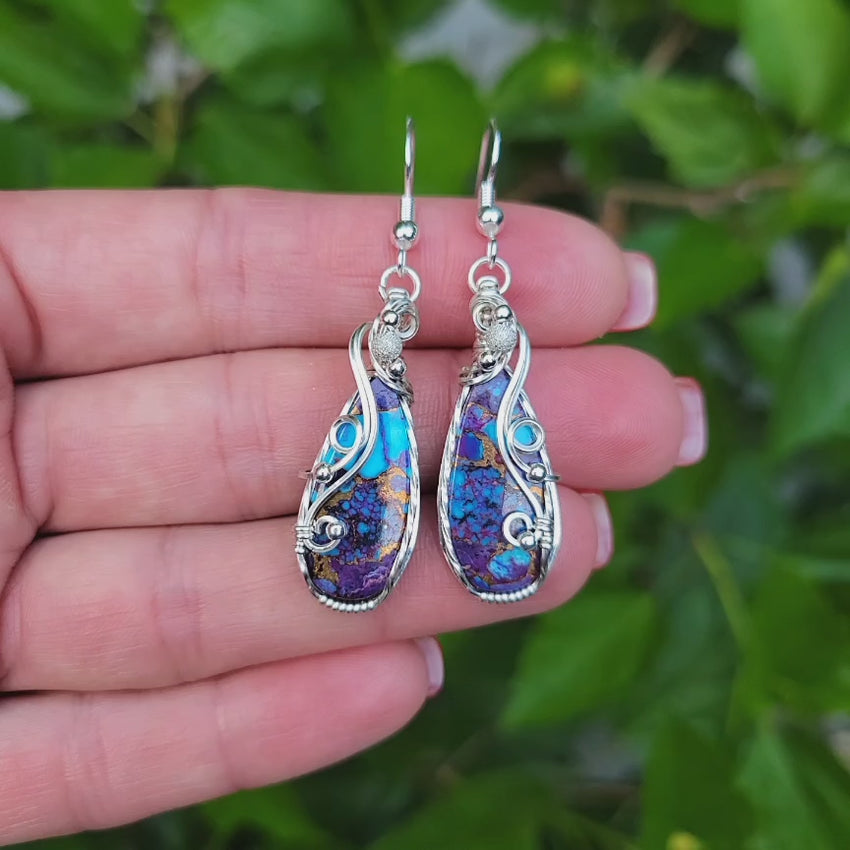 These elegant designed, teardrop shaped, "Made in Germany" Purple Mohave with Kingsman Turquoise earrings have been creatively wrapped, using .925 sterling silver wire.