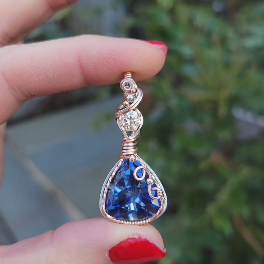 This stunning, royal blue Mystic Topaz and Moissanite double pendant has been creatively wrapped using mixed metals such as 14k rose gold filled and .925 sterling silver wire. Tiny sterling silver and rose gold filled beads have been added to the pendant to give it its unique design.