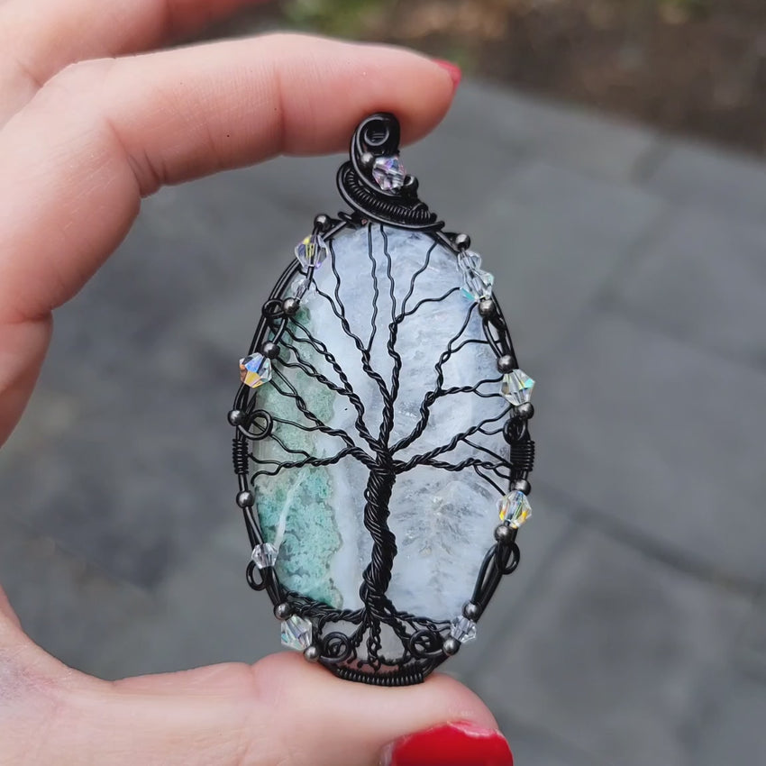 The pendant has small round, gunmetal beads and bicone Swarovski crystals incorporated into the framed tree pendant to make this beauty a one of a kind creation.